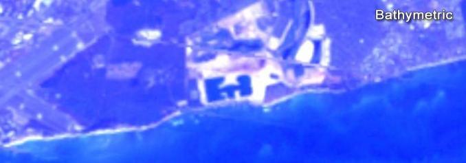 测深波段组合 (4,3,1) 使用红色 (4)、绿色 (3) 和沿海波段在水中达到峰值。沿海波段在沿海、测深和气溶胶研究中很有用,因为它反射蓝色和紫色。该波段组合有利于估算水中的悬浮沉积物