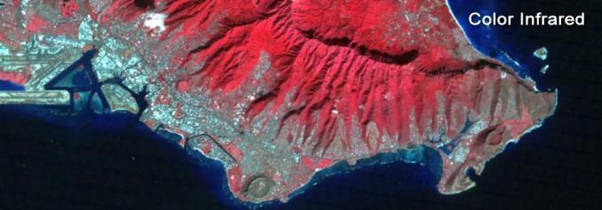 自然色使用红色 (4)、绿色 (3) 和蓝色 (2) 的波段组合。它复制的内容接近我们人眼所能看到的内容。健康的植被是绿色的,不健康的植物是棕色的。城市特征呈白色和灰色,水呈深蓝色或黑色
